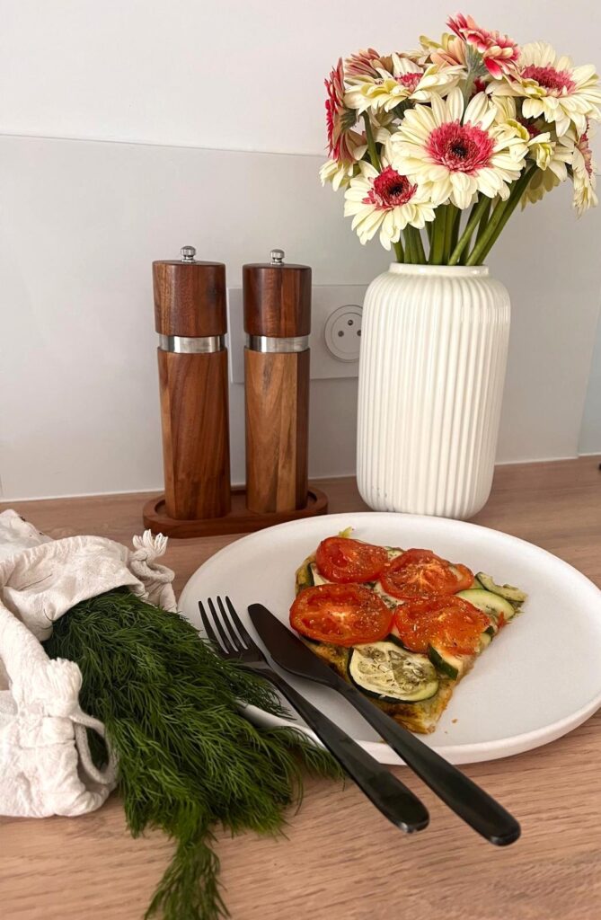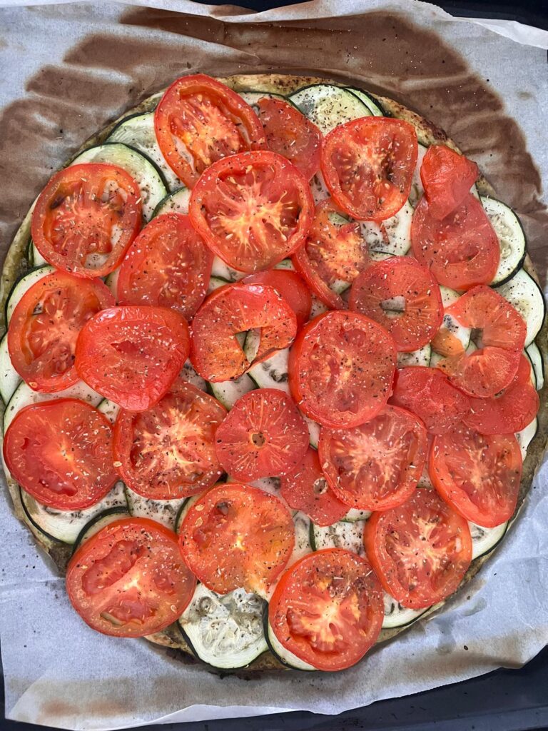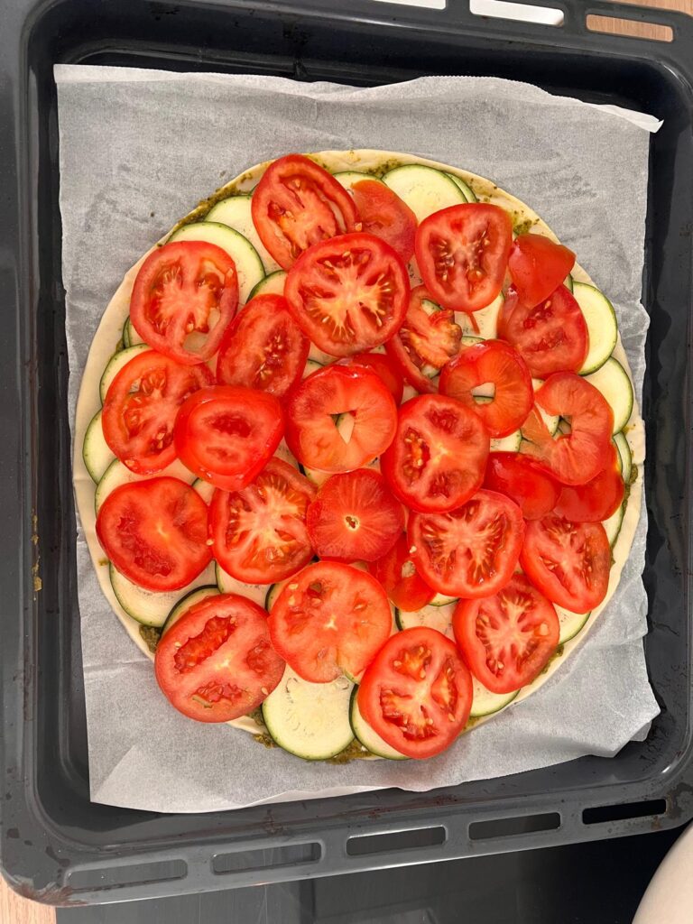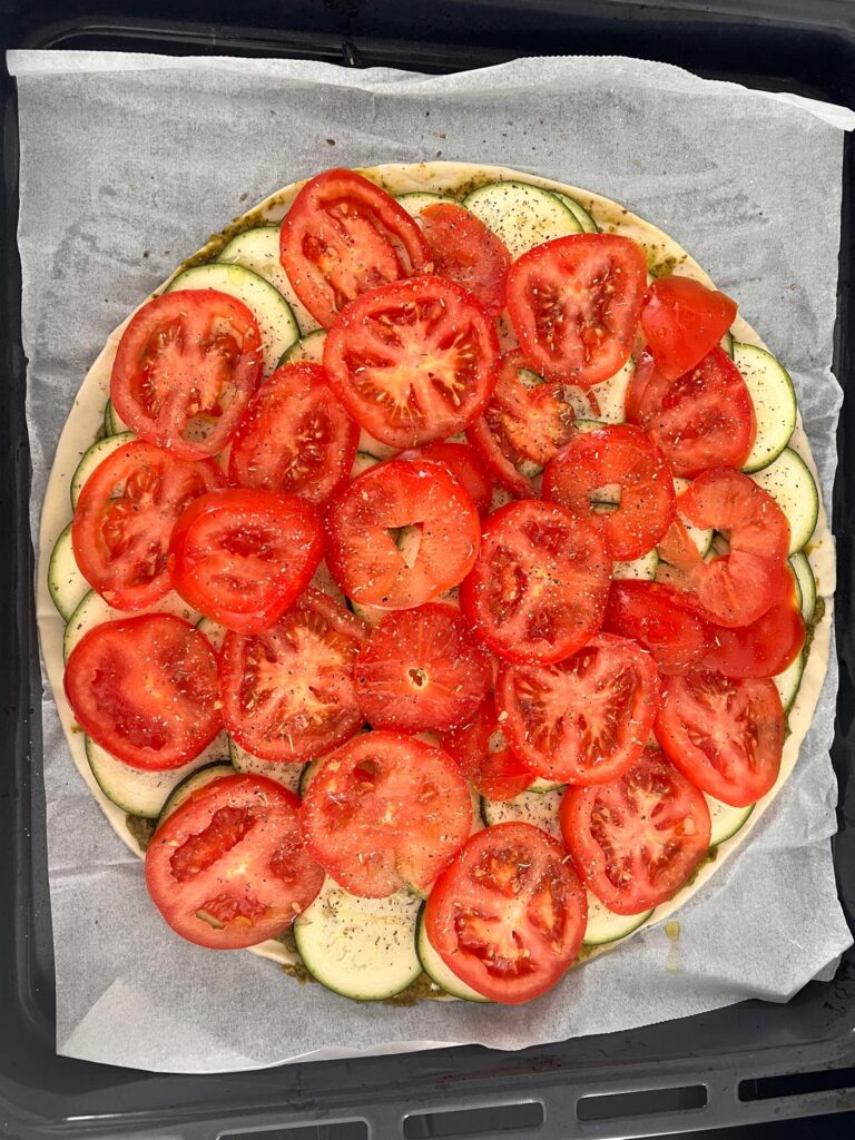 Tarte Fine au Pesto, cougette, tomate & aux herbes