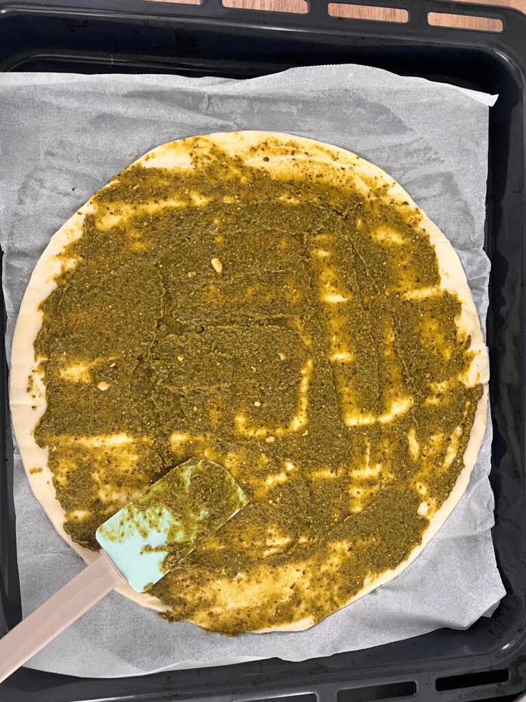Sur la pâte feuilletée étalez le pesto.